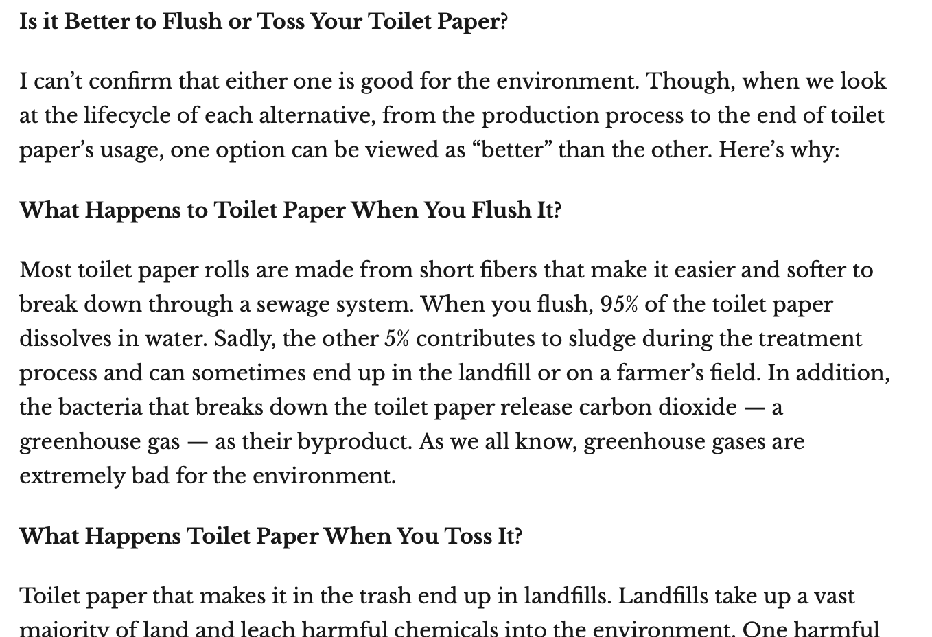 That article, excerpted above, says that there is a cost (what economists call an ‘externality’) for toilet paper disposal, whether disposed of in a toilet, or in a landfill.