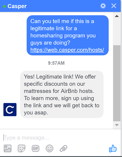 Given that we know that criminals running phishing companies are desperately eager to get Airbnb host’s emails, so that they can send them phishing links in the form of fake emails from AIrbnb, and given that scammers and criminals often create their fake web pages by combining the company name with some other bits and pieces in the URL, I would suggest that this link looks more like a criminal operation than a real page from Casper.