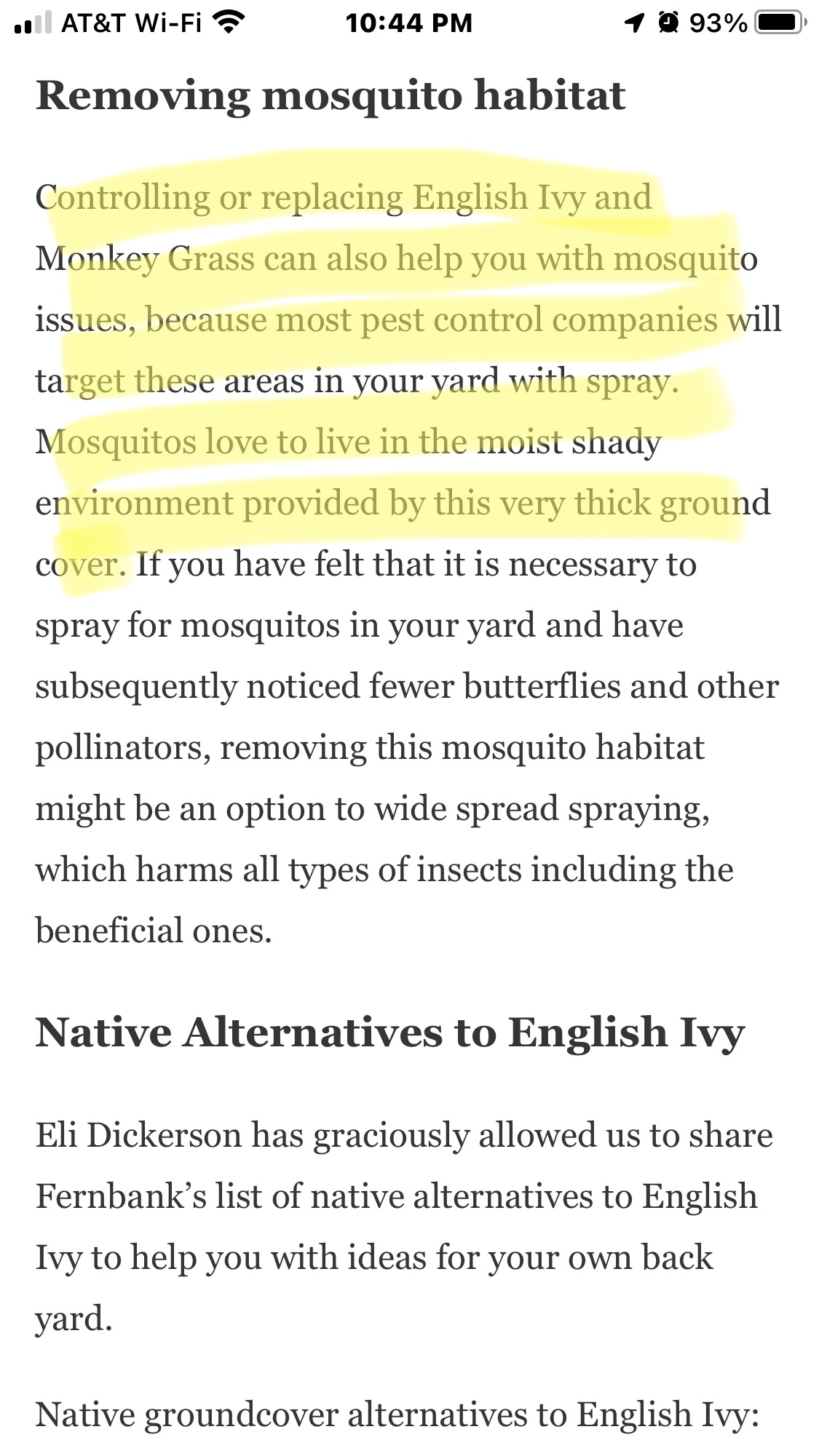 And yes, ivy does present a problem when it comes to mosquitos. The soil underneath the ivy stays damp and mosquitos breed there.