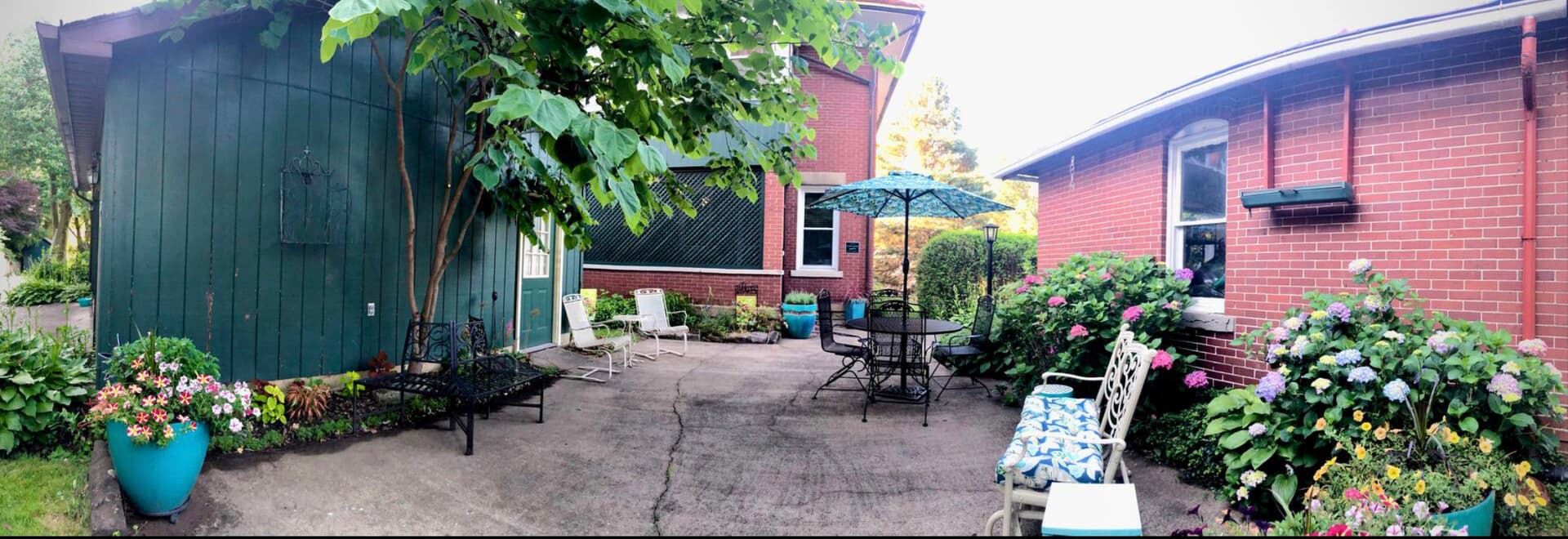 A panoramic photo of the patio. The ivy covered hillside is behind me.