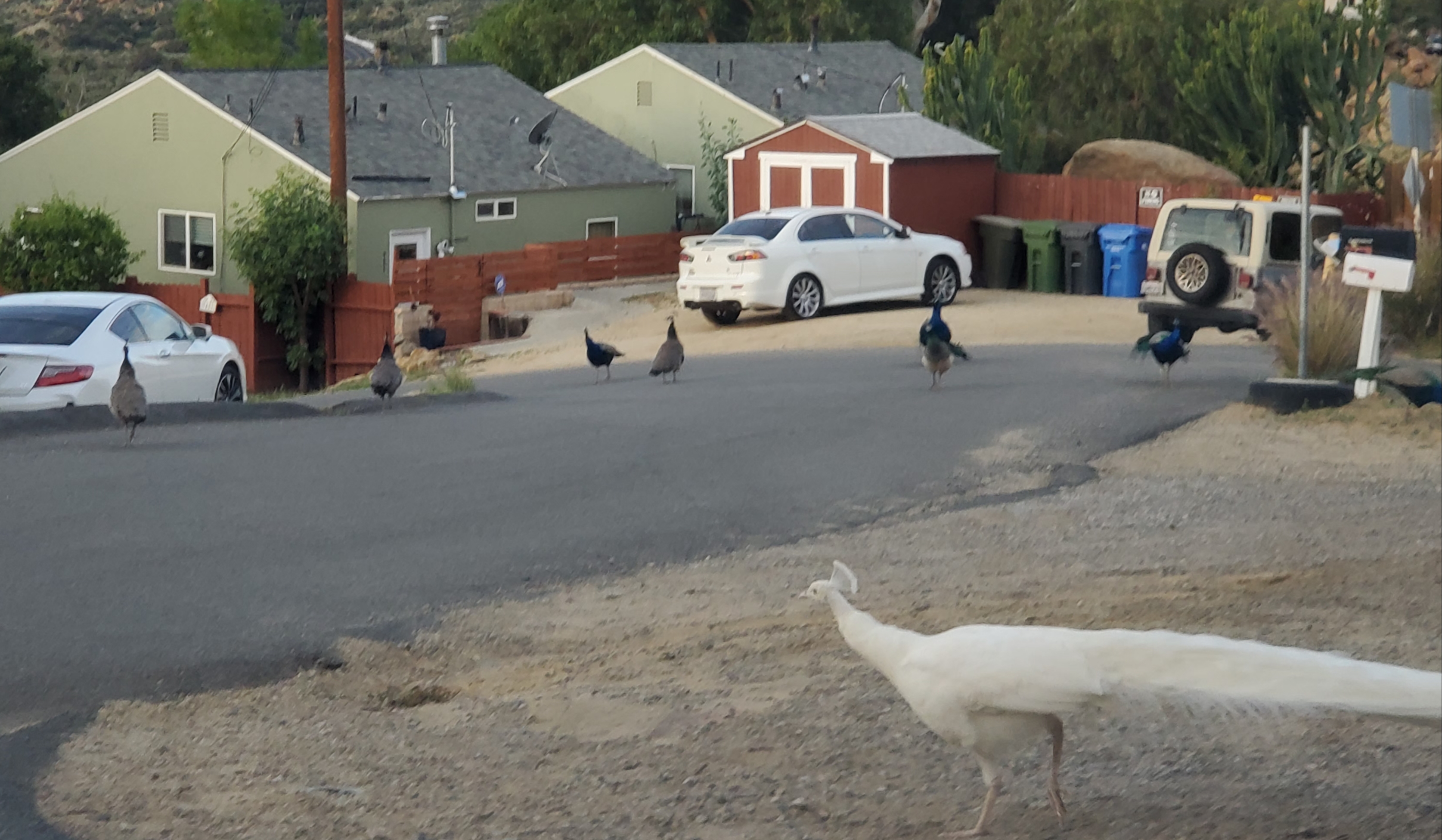 Thank you Dusty for your stay and this beautiful note and photos. It was great to meet you and have you as a guest! I love the photo of the owls:) There are dozens of peacocks below us in the unincorporated Chatsworth Lake Manor, and white (I’m guessing albino as its skin and eyes are pink) ones. The one in photo is a getting to be a mature male.